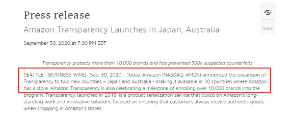 最近,亚马逊又宣布,将Transparency透明计划扩展至亚马逊日本和澳大利亚站点,至目前为止,这项服务已覆盖亚马逊全球十大站点。(如下图)