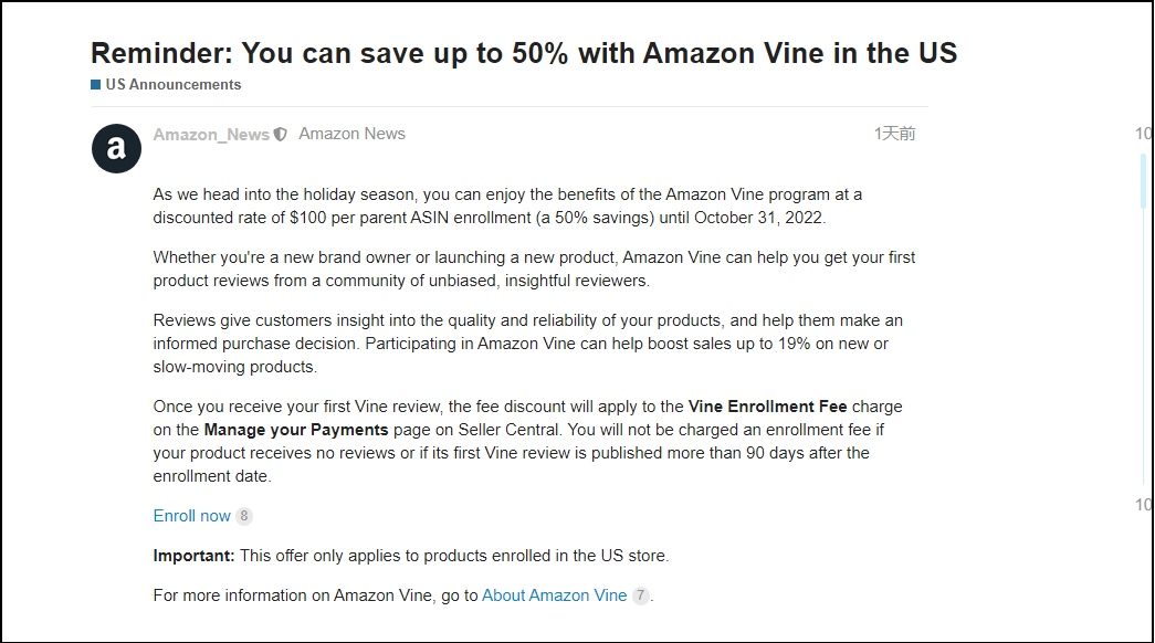 通知称,在2022年10月31日之前,卖家享受亚马逊Vine计划的优惠,每位卖家在注册时享受50%的折扣。