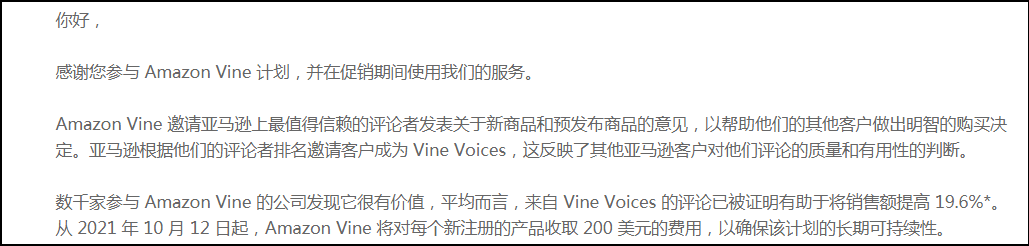 不过,从2021年10月12起,Amazon Vine不再免费,对每个新注册的产品收取200美元的费用。(如下图)
