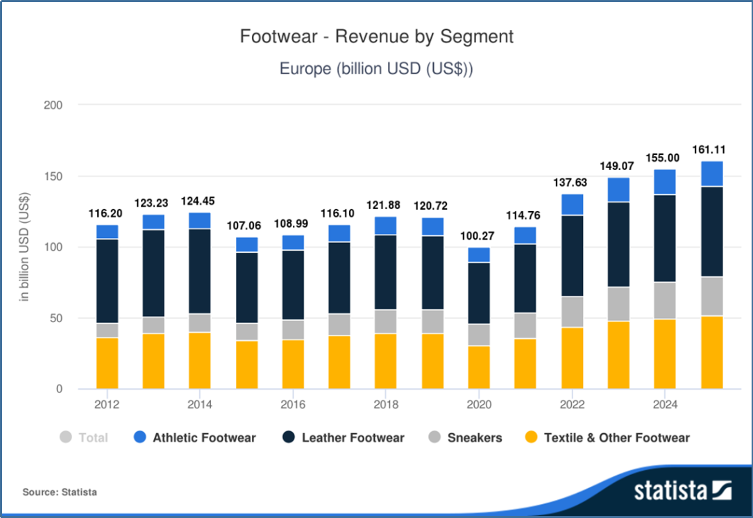 而在欧洲方面,预计到2022年底,欧洲鞋类市场的人均购买量将达到3.5双,欧洲鞋类市场预计销量将达到30亿双,其中线上销售占41.6%。欧洲鞋类市场的销售整体收入将达到1376亿美元,89%的销售额将来自非奢侈品鞋。