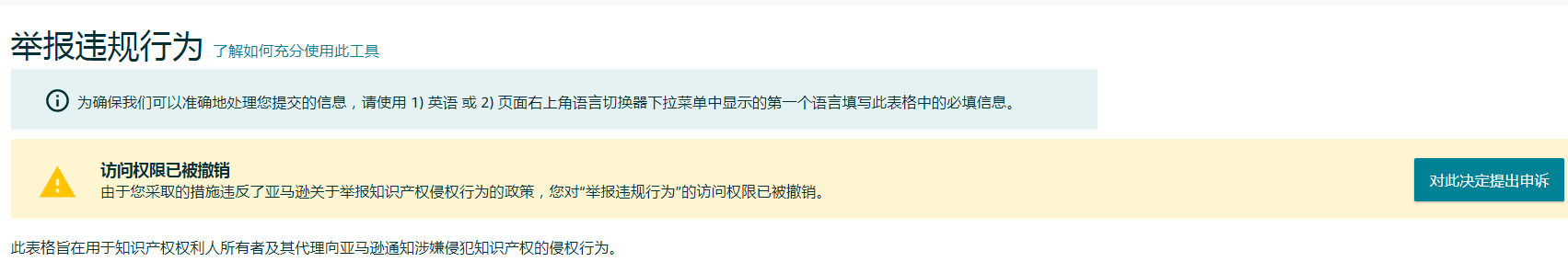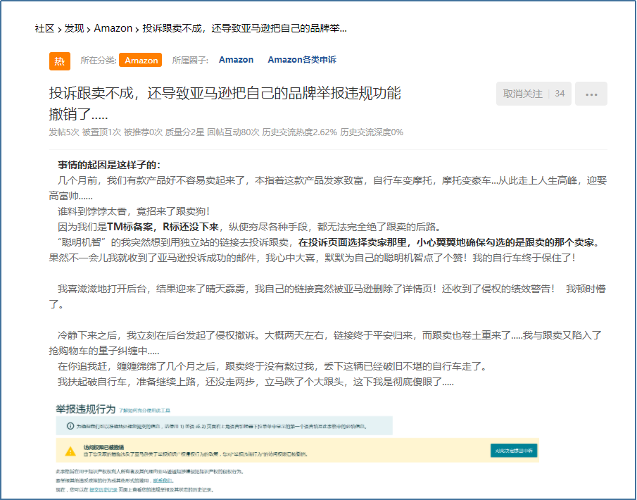简单地说,就是投诉跟卖导致自己亚马逊店铺品牌举报违规功能被撤销了。