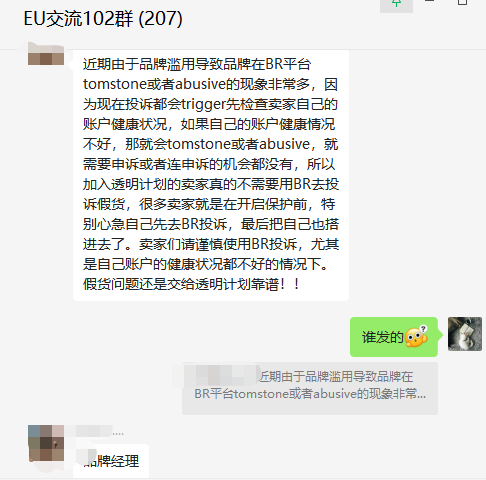 不过EU交流群的卖家爆料,近期由于品牌滥用导致品牌在BR平台tomstone或者abusive的现象非常多,因为现在投诉都会trigger先检查卖家自己的账户健康状况,如果自己的账户健康情况不好,那就会tomstone或abusive,就需要申诉或者连申诉的机会都没有,卖家谨慎使用BR投诉尤其是自己账户健康状况不好的情况下。假货问题建议交给透明计划更靠谱一点。