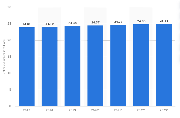 据数据分析统计显示,在2017年至2020年上半年期间,波兰在线购物的消费者数量以每年19万的增长速度飞速发展;在线购物消费者数量从2400万增加到近2477万,仅仅用了三年时间。而这个数字还在随着大环境的变化(如疫情导致欧洲各国进入封锁阶段)不断催化,预计2023年在线购物消费者数量将达到2514万。