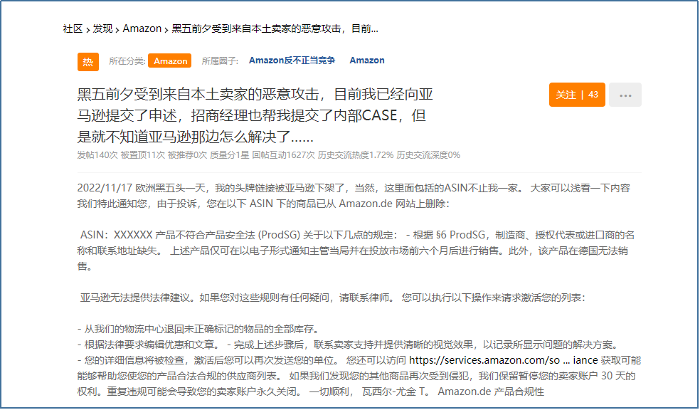 帖子称,在欧洲“黑五”前一天,由于遭遇恶意攻击,头牌链接惨遭下架,究其原因是“产品不符合安全法的规定。“