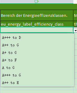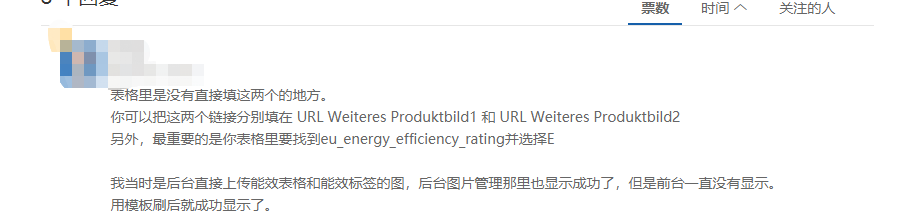 用模板刷新链接,可以把这两个链接分别填在 URL Weiteres Produktbild1 和 URL Weiteres Produktbild2。另外,最重要的是在表格里要找到eu_energy_efficiency_rating并选择E。用模板刷后就能成功显示。