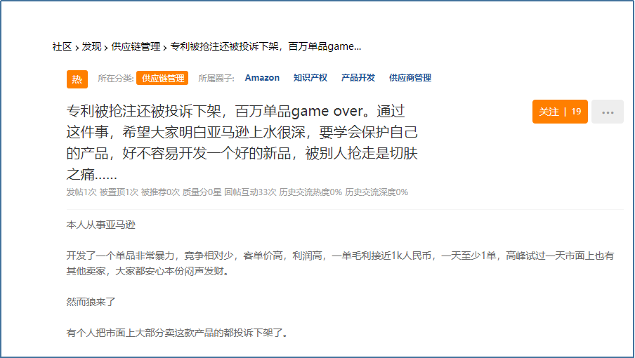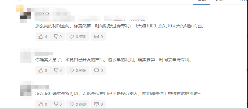 也有的卖家认为,”确实大意了,毕竟自己开发的产品,这么高的利润,确定要第一时间去申请专利。“