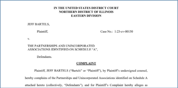 1月11日,JEFF BARTELS品牌方委托Keith律师所,在美国伊里诺伊州法院发起了图片版权案,案件号为:23cv00150。总之,起诉的律所,法院,是熟悉的律所,熟悉的法院。