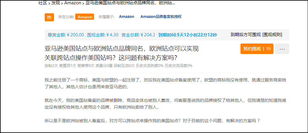 据论坛卖家介绍,他原来注册了美国与欧盟商标,在美国站将美国商标也进行了品牌备案。