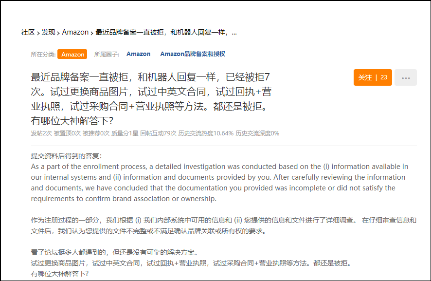 “品牌备案一直被拒,和机器人回复一样,已经被拒7次,试过更换商品图片,中英文合同,试过采购合同+营业执照等方法都还被拒。”