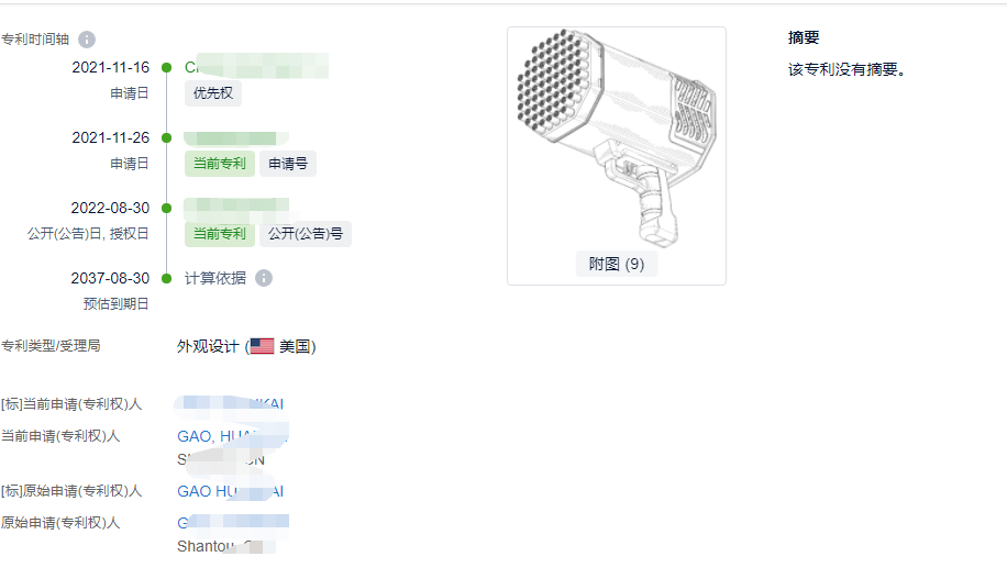 经查询,该款产品已于2022年8月30日申请了美国外观专利,有效期到2037年8月30日。