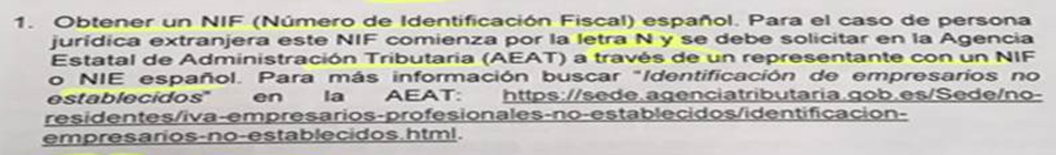 1. 获得西班牙NIF(税务识别号即西班牙VAT)。对于外国法人实体,该NIF以字母N开头,必须通过具有西班牙NIF或NIE的代表向国家税务管理局(AEAT)提出申请;