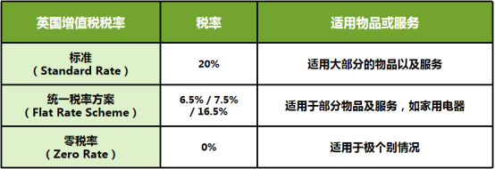 其中,英国有三种增值税税率:标准税率(Standard)、统一税率方案(简称低税率),以及零税率。他们分别适用于不同的情况进行申报。