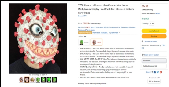 在亚马逊商品销售卖名称叫“ Corona万圣节面具”和“ Corona乳胶恐怖面具”,面具售价为14.59英镑,有鲜绿色或红色的不同款式。