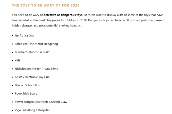 值得注意的是,美国早已公布了2020年危险的10大玩具,销售此类玩具有可以遭亚马逊销售平台下架的风险。