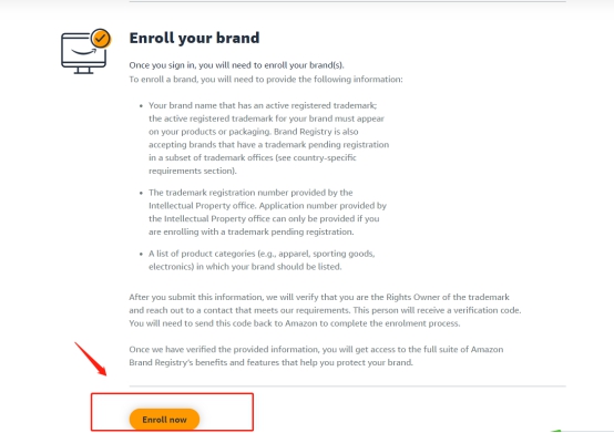 3.进入之后,将页面拉到最后,在”Enroll your brand”点击“Enroll now”。如下图: