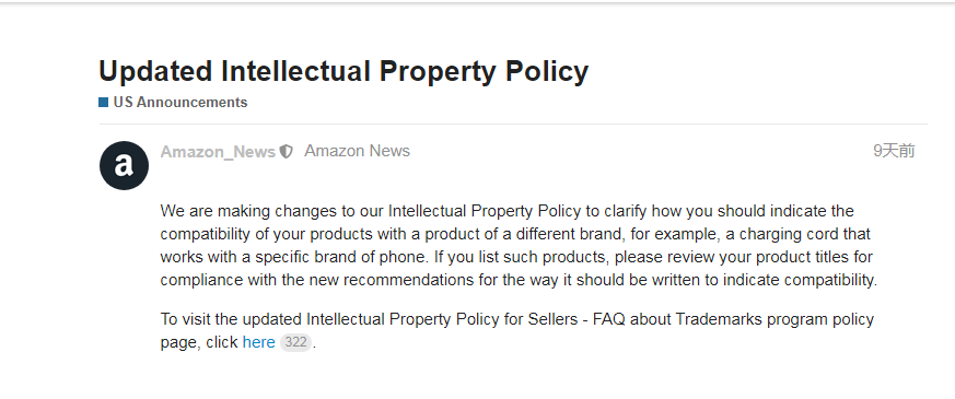 亚马逊宣布:“我们正在修订知识产权的政策,以指导卖家应如何描述自家产品与其他品牌产品的兼容性。比如售卖与特定品牌手机兼容的充电线时,需检查充电线标题描述是否符合新的政策建议,以表明兼容性(不知道,你身边的朋友知不知道这个消息,如果不知道,记得将这条消息转发给他看看)。