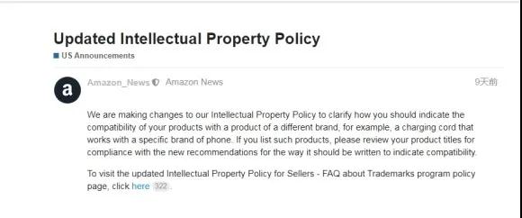 亚马逊宣布:“我们正在修订知识产权的政策,以指导卖家应如何描述自家产品与其他品牌产品的兼容性。