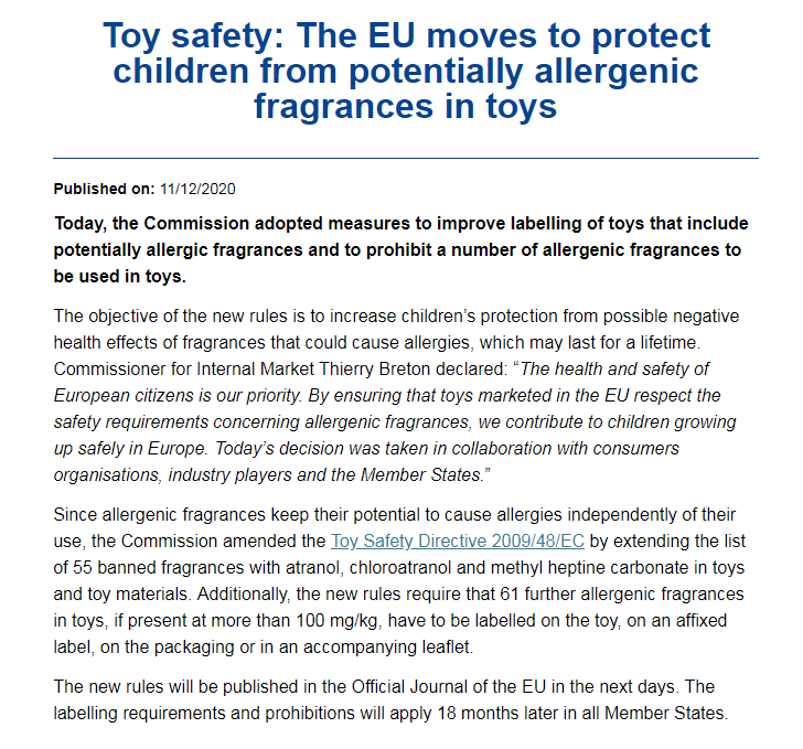 欧盟委员会于2020年12月11日采取了一些措施来改善玩具的标签,其中包括潜在的过敏性香精,并禁止在玩具中使用多种过敏性香精。新规定的目的是增强儿童的保护,使其免受可能引起过敏的香水对健康的负面影响,这种影响可能持续一生。
