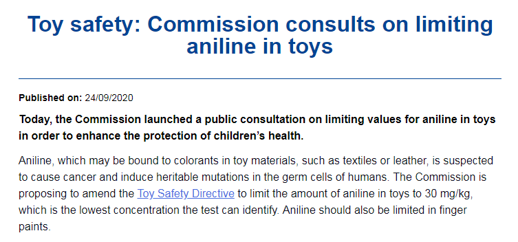 2020年9月24日,欧盟委员会就限制玩具中苯胺的含量启动了公众咨询;提案中提及到苯胺可能与玩具材料(如纺织品或皮革)中的着色剂结合,被怀疑会导致癌症并在人类生殖细胞中诱发可遗传的突变。因此欧盟委员会提议修订《玩具安全指令》,限制玩具中苯胺的含量为30 mg/kg,此限值是实验室可以检测到的最低浓度。