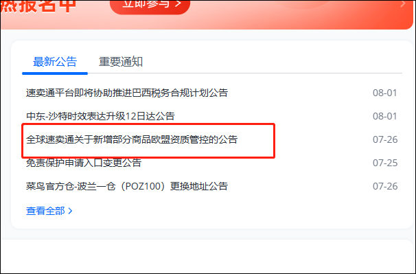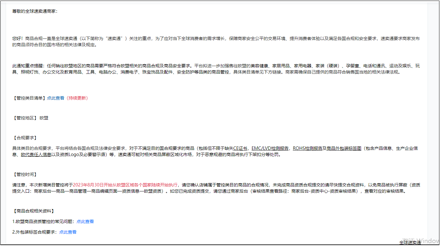 与此同时,速卖通平台也在最近发布了新增部分商品欧盟资质管控的公告。