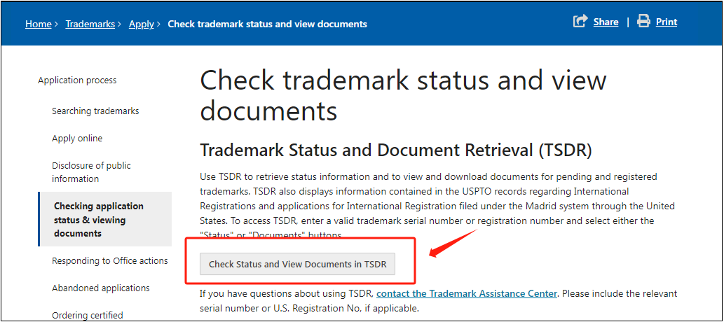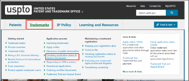 网址:https://www.uspto.gov/,点击【Trademarks】下的【Checking application status&viewing ducuments】