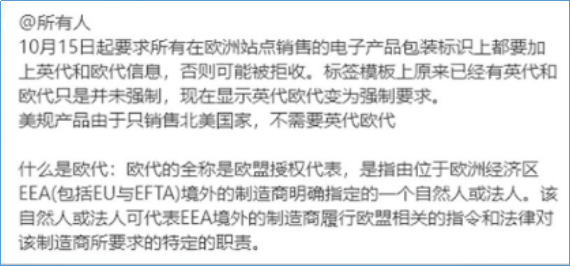 2.欧盟授权代表的信息要求清晰牢固,一般我们建议欧代地址、电话信息等尽可能地印刷在产品,使用说明或者是包装上最好测试一下贴纸能否在摩擦、冷热以及湿度不同的情况下,依然可以保持清晰以及完整。