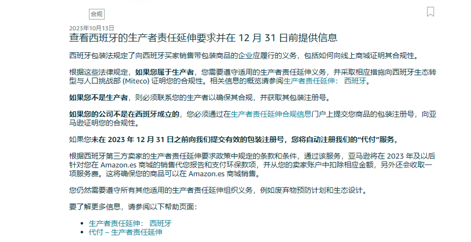 通知提到,亚马逊将强制卖家注册西班牙包装法,如果在规定期内仍未提交有效西班牙包装注册号的卖家,亚马逊将自动为其注册“代付”服务。