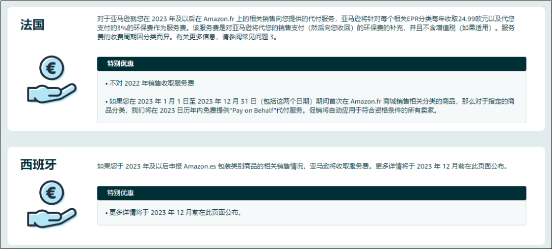 如果不注册西班牙包装法,亚马逊将自动提供代付服务,并且从卖家账户收取一定的服务费与环保款。亚马逊将在2023年12月前公布具体的收费标准。