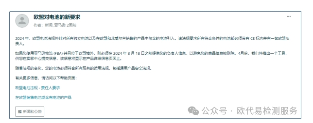 公告提醒卖家,欧盟电池新法规《电池与废电池法规》已经正式生效,新法规要求所有出口到欧盟和北爱尔兰的电池带有CE认证,并具有欧盟负责人(简称欧代)。