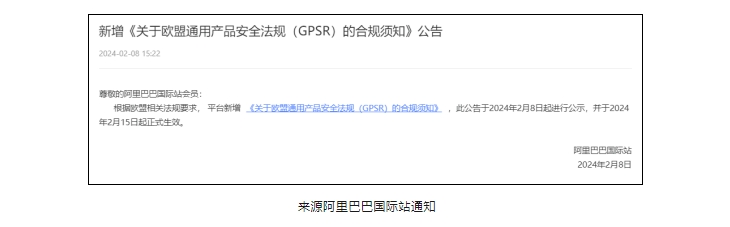 公告提到,根据欧盟相关法规要求,平台新增了《关于欧盟通用产品安全法规(GPSR)的合规须知》,2月8日公示后,2024年2月15日起正式生效。