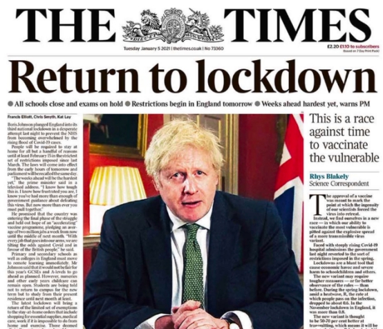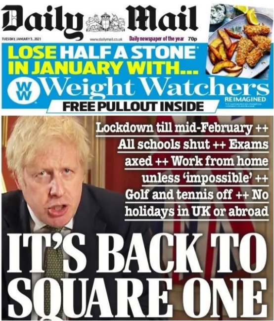 英国首相约翰逊警告说,随着新冠变种病毒的传播,英国可能在未来几周内采取”铁碗“的防疫限制。而在1月5日,英国很多知名媒体的头版将英国脱欧后,将首次”铁腕“封国的消息霸屏了。