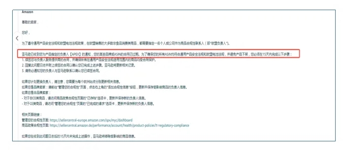 邮件提到,亚马逊已收到你为产品指定负责人的通知,你的某些产品或ASIN的合同已过期,为了确保你的所有ASIN符合GPSR及欧盟电池法规,并避免产品下架,卖家须在15天内对于续签的欧代合同完成如下操作:1.续签您与负责人服务提供商的合同,并确保所有在通用产品安全法规适用范围内的商品均受合同保护。