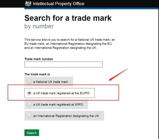 3.下一步,在“The trade mark is”选择a UK trade mark registered at the EUIPO这个选项。然后点击“Search”查询,就会显示出UK的商标号及其它信息。(如下图)