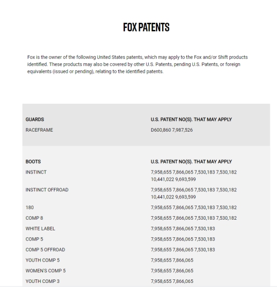 Fox Racing官方显示的专利