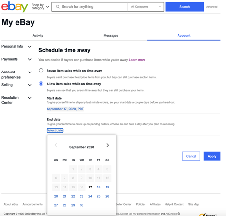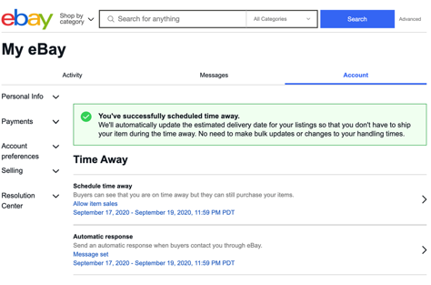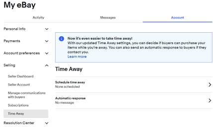 eBay假期模式有新的变化,在放假休息期间,记得安排上休假新工具time away,提前设置好店铺休假模式,休假卖货两不误。