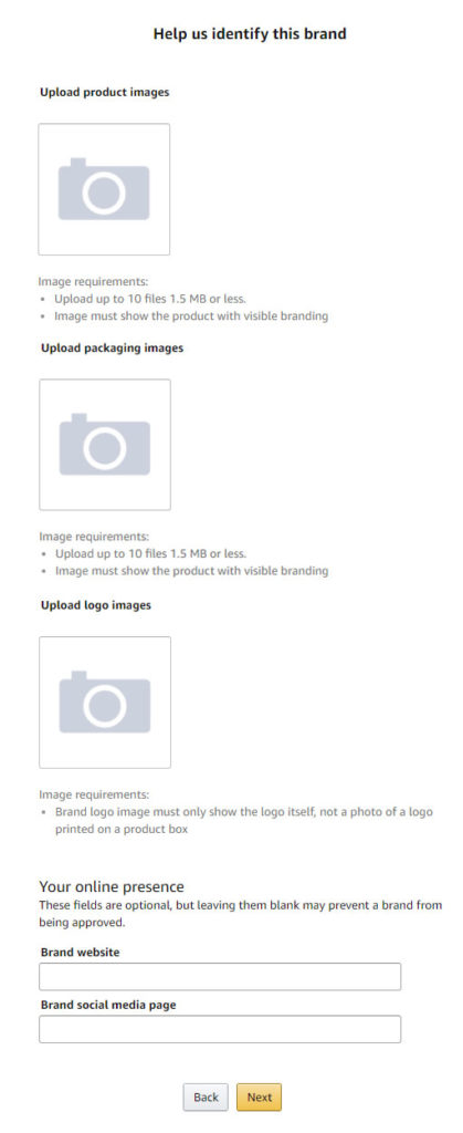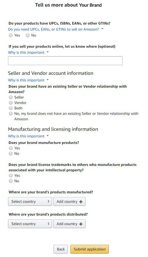 最后,你将被要求提交更多关于产品和品牌的信息,包括你所注册产品的制作产地以及之后的分销地。如下图所示: