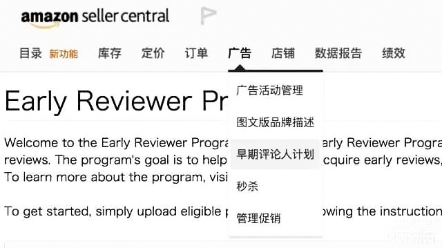 第二步:进入卖家中心 -> 广告 -> 早期评论人计划。
