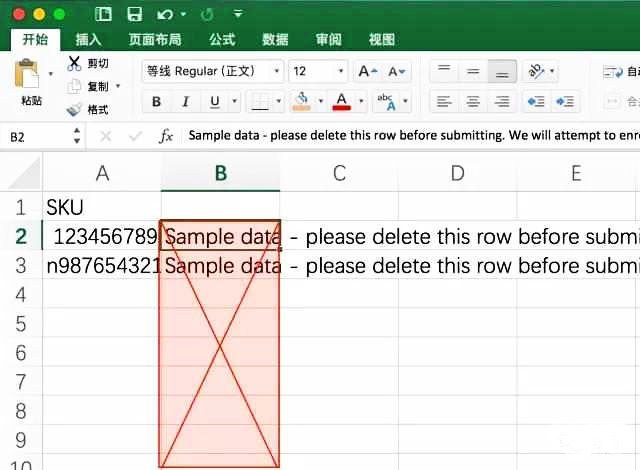第四步:在Excel表格A列中填写需要参加早期评论人计划的产品SKU,并删除B列的内容。