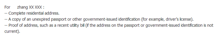 3、Proof of address, such as your last utility bill (if the address on your passport or government issued identification is not current) 地址证明,信用卡账单、水电煤气费账单。